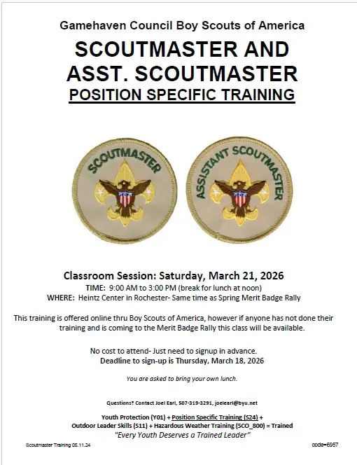 • February 25 – Wednesday – Training at 6:30pm @ Scheels Dept Store, Apache Mall in Rochester.